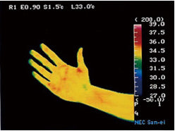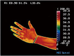 As can be seen from the thermography tests below - POWER IONICS negative ion necklaces and bracelets significantly enhance the wearer's circulation. This increase in circulation may assist with the body’s ability to recover from injury and may assist those who suffer from poor circulation. Of course, anyone wearing a Vital-ion necklace or bracelet may also enjoy the benefits from an improved circulation and a speedier recovery.